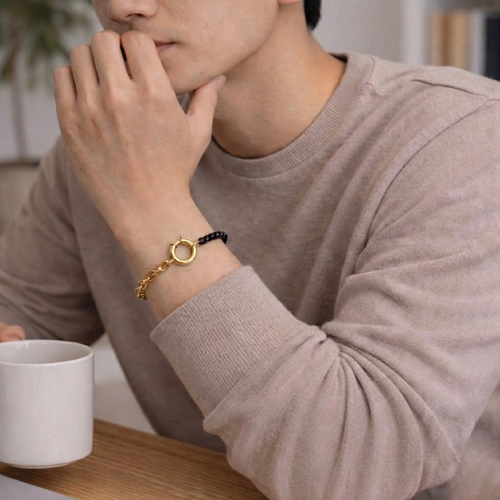 Crafted in premium stainless steel, this refined bracelet pairs sculptural black accents with fluid metal links and a signature circular clasp, creating a silhouette that feels modern, architectural, and effortless on the wrist.